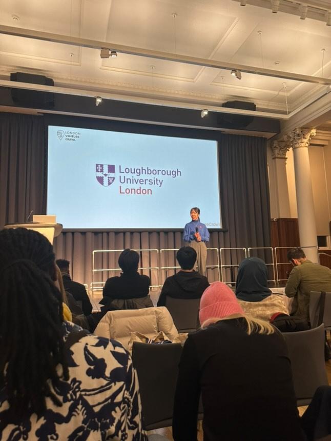 Delivering a pitch on stage to 200+ students from 19 universities as part of a startup programme.
