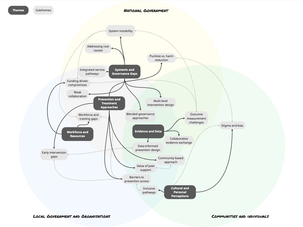 Five main themes and their subthemes are organised across three levels of influence: national government, local government and organisations, and communities and individuals. Solid lines show theme-subtheme links, while dotted lines depict connections across subthemes.