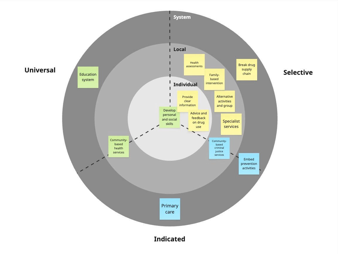 Illustration showing the UK substance use prevention largely centres on selective interventions, with far less focus on universal, whole-population approaches.