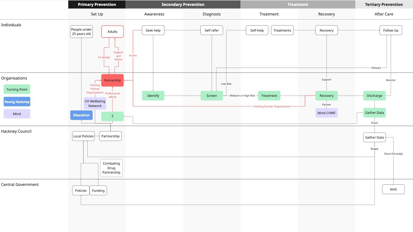 As my master's dissertation, I partnered with Hackney Council to redesign primary prevention partnerships with council teams and local organisations to reduce substance‑related harms.
